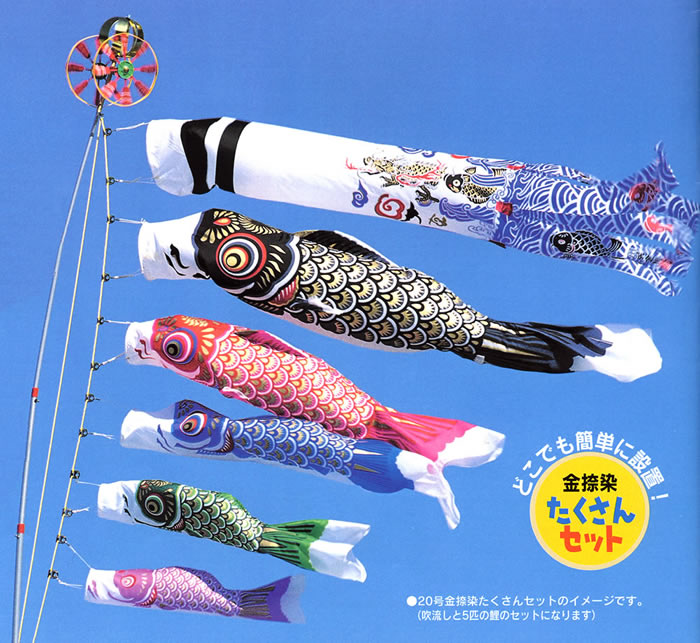 お庭用煌鯉セット 6m<ジャイアントポール付き>【楽ギフ_のし】【楽ギフ_のし宛書】価格: 200,710円レビュー評価: 0.0 レビュー数:0 サイズ セット内容:金箔波柄吹流し6m煌鯉極上金箔ぼかし染め黒鯉6m(他、赤鯉・青鯉・緑鯉 鯉4匹セット) ナイロンタフタ生地使用 極上金箔ぼかし染め他、矢車・掲揚用ロープ等の部品が揃っています。ジャイアントポール12号付 (約12m) (強力ダブルパイル方式 回転滑車付で絡みにくい!)全ての部品が揃っています。買い足すものはありません。日の光を全身に浴びて、その輝きは眩いほど上品。細部に至るまで手の込んだ職人技が光る名品です。生地にも最新の縫製技術を用いたナイロンタフタ生地を採用。軽量化、耐久性を向上させております。「良く泳ぎ、水に強い」鯉のぼりとなっています。伝統の五色の吹流しも色あざやか |