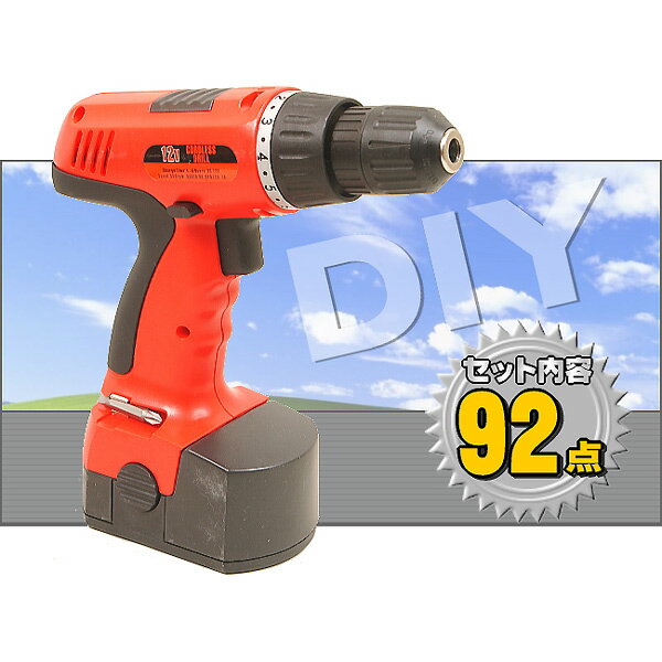 ガーデニングや日曜大工に!DIYを楽しくさせるフルセット!12Vコードレス充電式電動ドリル 電動ドライバー92点セット【メール便不可】価格: 3,980円レビュー評価: 0.0 レビュー数:0 ※こちらの商品はメール便不可となります。 名称 12Vコードレス充電式電動ドリル 電動ドライバー92点セット セット内容 マイナスドライバー(ロング)×3 , プラスドライバー(ロング)×6 , 六角ビット(ロング)×3 マイナスドライバー(ショート)×4 , プラスドライバー(ショート)×8 , 六角ビット(ショート)×6 六角レンチ×4 , コンクリート用ドリル(3?10mm)×10 , 充電器×1 , ACアダプター×1 本体×1 , 延長アダプター×1 , 研磨用ポイント×5 , 板錐(12?20mm)×3 六角ナット(5?13mm)×9 , 金属用ドリル(1.5?10mm)×10 , |